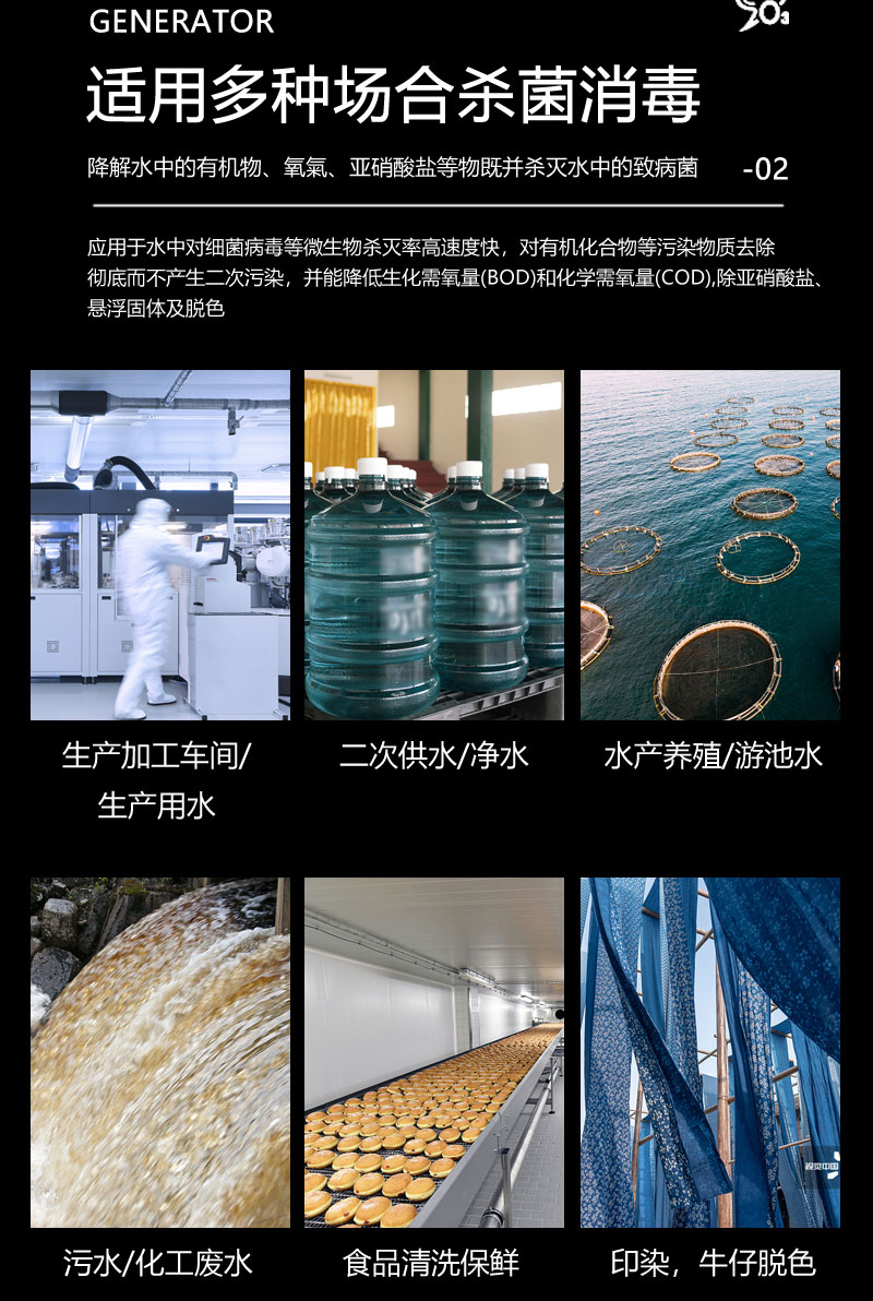 ◆應(yīng)用于水中對(duì)細(xì)菌,病毒等微生物殺滅率高速度快,對(duì)有機(jī)化合物等污染物質(zhì)去除徹底而不產(chǎn)生二次污染,并能降低生化需氧量(BOD)和化學(xué)需氧量(COD),除亞硝酸鹽、懸浮固體及脫色
